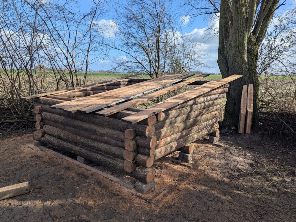 We deden opnieuw vele uren aan brandnetelpulling en dreigen deze strijd toch echt definitief te winnen. We schroefden het valkenkast van de buurvrouw aan de grote es. Maar hoogtepunt van de laatste weken was de bouw van de Vindskydd, een stokoude wens. Op onze trektochten door Scandinavie overnachtten we dikwijls in zo’n schuilhut, vuurtje er voor, eindeloos uitzicht.