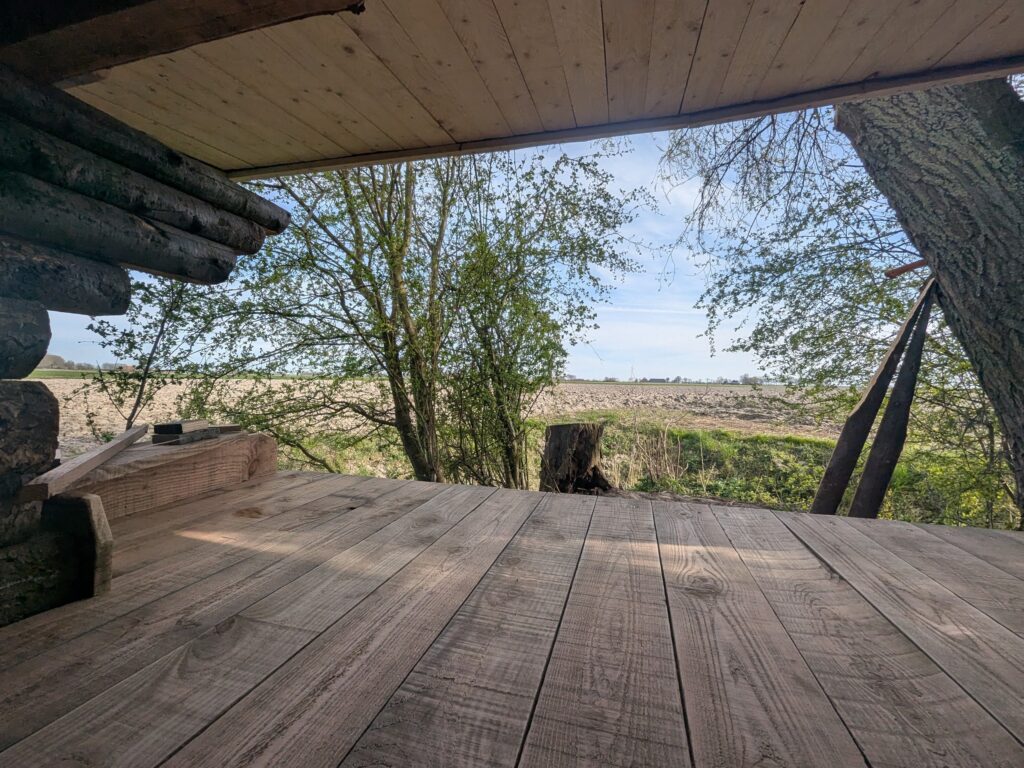 Met dank aan zwager Darius voor dertig stammetjes douglas, vriend Eric voor het transport en het kantrechten, zonen Thijs en Sep voor ondersteunende diensten en hun vrienden Jelle en Daniel voor spitsvondig timmeren en onszelf niet in de laatste plaats staat er nu zo’n zelfde Vindskydd op de hoek van ons terrein.